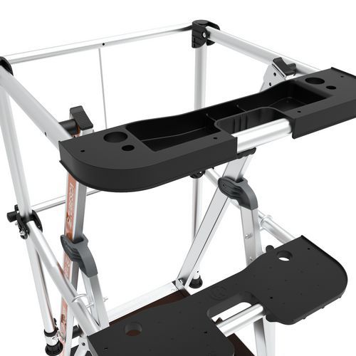 Veloce-liggers is de verwijzing naar elk afzonderlijk werkplatform. Dit platform is licht, compact, zeer mobiel en kan worden verplaatst naar overal op de bouwplaats. Maximale veiligheid: Veloce voldoet aan alle Europese veiligheidseisen. Comfortabel voor de gebruiker: dit platform is voorzien van twee verwijderbare legborden. Het lage legbord heeft een draagvermogen van 25 kg en beschikt over een speciaal gedeelte voor het eenvoudig plaatsen van emmers verf of grote materialen. Stevige reling aan 4 kanten met liggers voor valbeveiliging met semi-automatische sluiting. Inklapbare wielen van 75 mm voor snelle en optimale mobiliteit. Antisliptreden van 80 mm. Verwijderbare gereedschapshouder met vakindeling, belasting van 25 kg, met geïntegreerde haken (max. 10 kg). XL-legbord, belastbaar tot 25 kg. Antislipvloer 500 x 400 mm van hout uit duurzame bronnen, met automatische vergrendeling. Ergonomische werkruimte. Intrekbare stabilisatoren met afstelling in millimeters. Transportwielen Ø 100 mm voor uitvoering met 2 tot 6 treden, Ø 175 mm voor uitvoering met 7 treden.