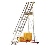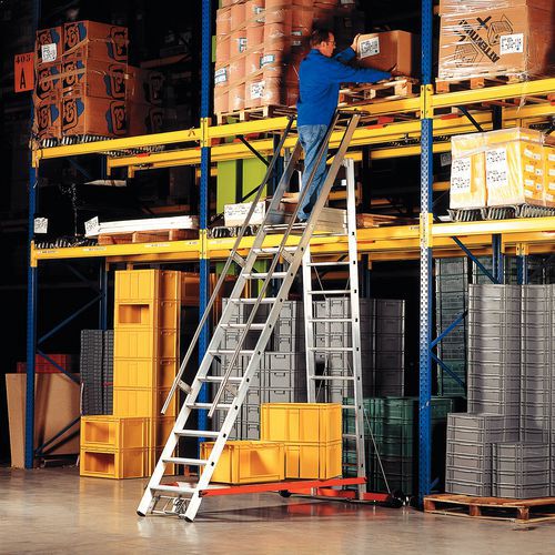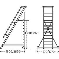 Mobiel platform met slipvaste treden. Comfortabel met brede, geribbelde treden. Trap met 2 kantelbare stabilisatoren. 150 mm hoge plinten aan 3 kanten. Platform met inklapbaar wiel aan de voorzijde.