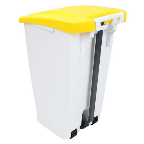 Mobiele afvalbak hanteerbaar dankzij 2 gladde wielen en de transporthandgreep. Afvalscheiding met gekleurde deksels. Eenvoudig te reinigen en met groot pedaal.