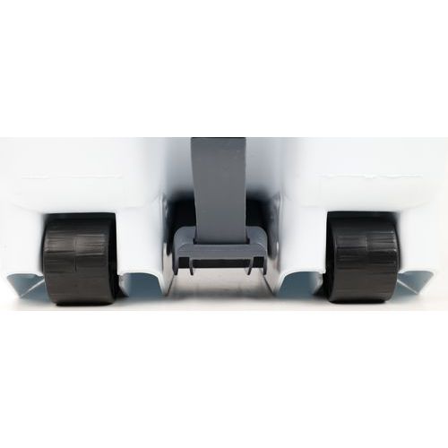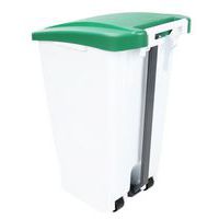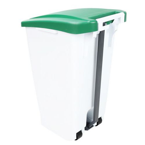 Mobiele afvalbak hanteerbaar dankzij 2 gladde wielen en de transporthandgreep. Afvalscheiding met gekleurde deksels. Eenvoudig te reinigen en met groot pedaal.