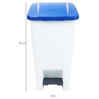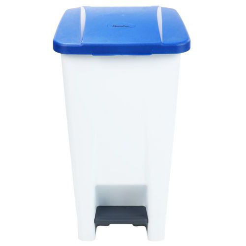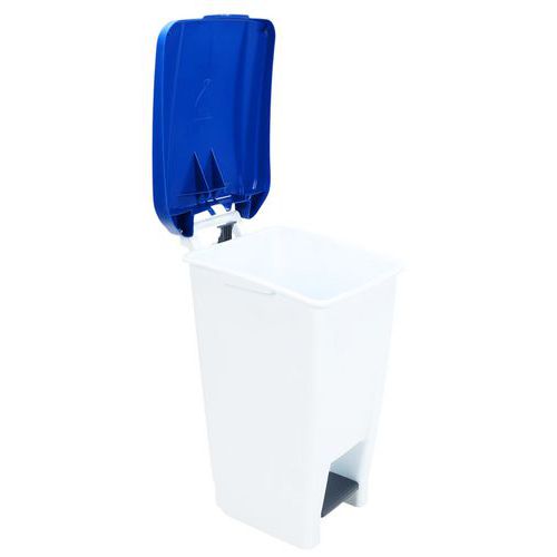 Mobiele afvalbak hanteerbaar dankzij 2 gladde wielen en de transporthandgreep. Afvalscheiding met gekleurde deksels. Eenvoudig te reinigen en met groot pedaal.