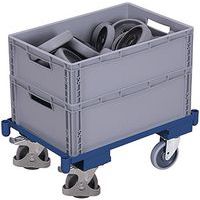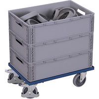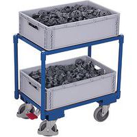 - Wagen met hoog platform, geschikt voor standaard bakken, 600x400 mm. De bakken zijn op een goede werkhoogte voor het bewerken en monteren.