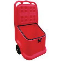 Kleine, mobiele zout- of zandbak van polyethyleen. Rubberen wielen en ergonomische handgrepen. Bestand tegen de meeste chemische producten, binnen en buiten te gebruiken. Stevig met pakkingen en klemring. Handgrepen.