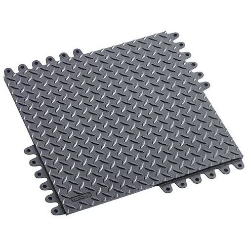 Systeem voor een bijzonder comfortabele antivermoeidheidsmat voor intensief gebruik, met oppervlak van diamantplaatstaal. Eenvoudig te monteren om grote oppervlakken te bedekken of individuele werkplekken te creëren.