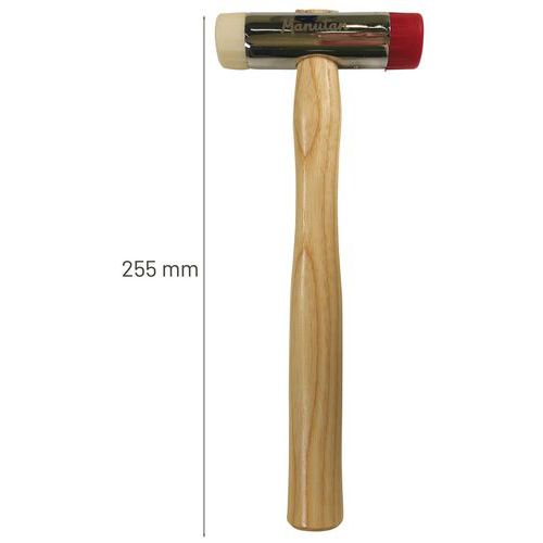Moker met verwisselbare hamerdoppen. Stalen kop met verchroomde afwerking. Heft van essenhout. De slagoppervlakken laten geen markering achter op de doppen. Geleverd met twee hamerdoppen van rubber en hardhout.