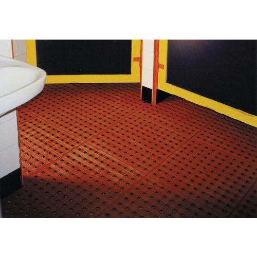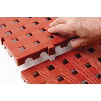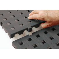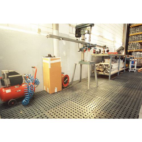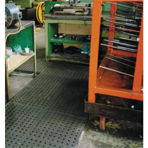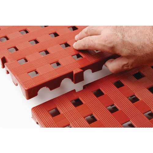 Gemakkelijk leggen door te koppelen. De uiterst sterke mat is bestand tegen natte of vettige vloeren dankzij de dikke structuur. Bestand tegen extreme temperaturen: van koud tot en met 70 ºC. Bij extreme temperaturen kan de grootte een kleine variatie vertonen. Gemakkelijk onderhoud. Gemaakt van lineair lagedichtheidpolyethyleen (LLDPE).