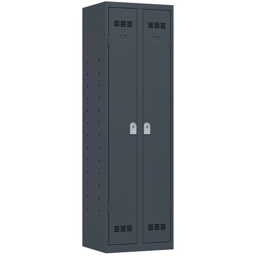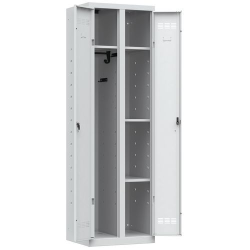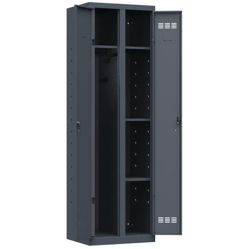 Multifunctionele garderobekast, 2 deuren. Bestaat uit een hangkast en een opberggedeelte. Modern assortiment waarin kwaliteit, veiligheid en design zijn verenigd. Gelast in de fabriek, voor een optimale stevigheid. Zeer goed bestand tegen inbraak. Veiligheidstips: - Plaats het meubel op een vlak oppervlak - Bevestig het aan de muur of een scheidingswand met een speciale bevestiging - Let erop dat u de aanbevolen maximale belasting niet overschrijdt en zorg voor een goede verdeling