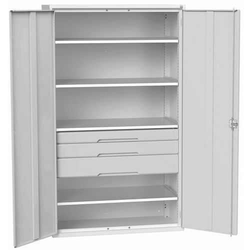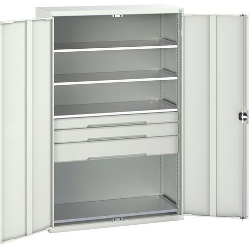 Constructie van gelast plaatstaal Verstevigde deuren met spanjoletslot met 3-puntsvergrendeling Geventileerde deuren voor een goede ventilatie en zichtbare inhoud Gemaakt in het UK Max. belasting (kg) : 1000 Max. belasting per legbord (kg) : 75