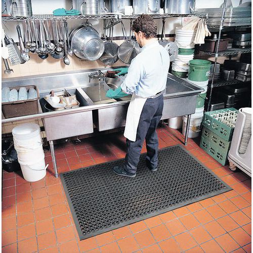Deze mat biedt basiscomfort en is geschikt voor vochtige en vettige omgevingen. Eenvoudig op te tillen, zodat u de vloer perfect kunt reinigen. Grote afvoergaten en verhoogde tapeinden. Voorgevormde afgeschuinde mat, geschikt voor personen met verminderde mobiliteit. Soepel antislipmateriaal dat vermoeiing tegengaat.
