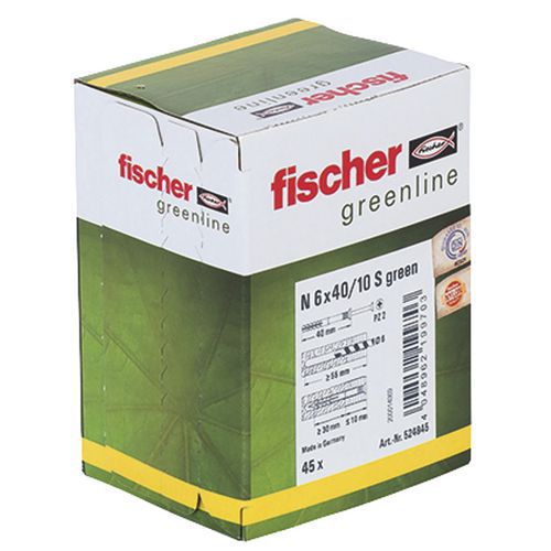| Productnaam | Nagelplug N Green 6 40 10 S, Plug lengte: 40 mm, Ø: 6 mm, Materiaal: Nylon, Type steun: Hout |