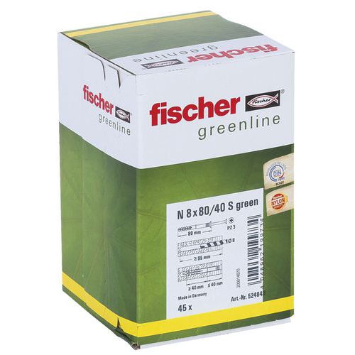 | Productnaam | Nagelplug N Green 8 80 40 S, Plug lengte: 80 mm, Ø: 8 mm, Materiaal: Nylon, Type steun: Hout |