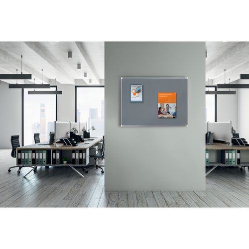 Vilt prikbord met een elegant aluminium frame en traditionele montage via hoeken. Uitstekend viltoppervlak om uw communicatie vast te pinnen en weer te geven