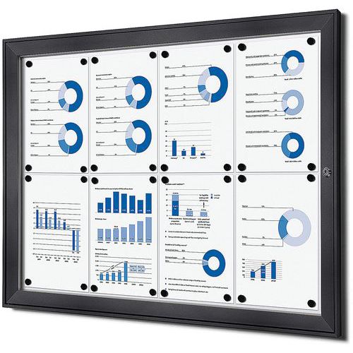 Geschikt voor binnen en beschutte buitenruimtes. Hoog PS impact helder voorpaneel. Droog uitwisbaar magnetisch bord voor markers en magneten.