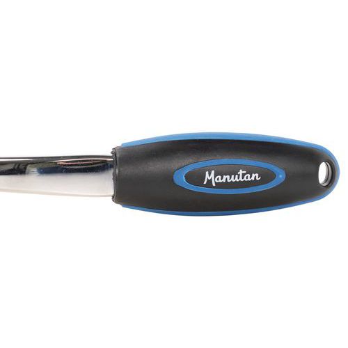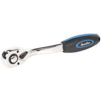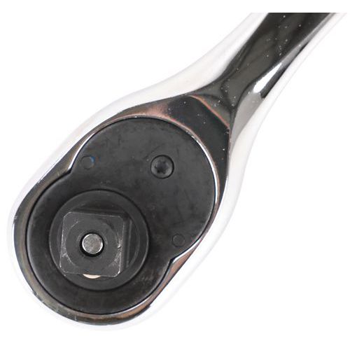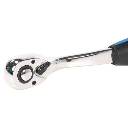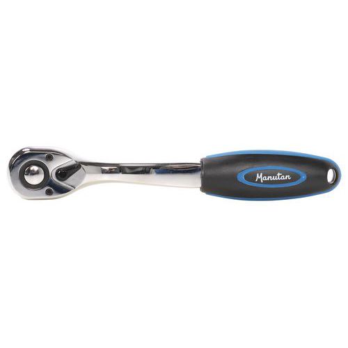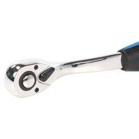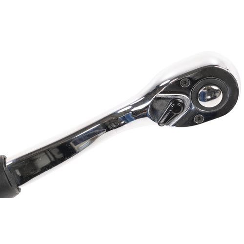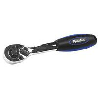 Ratel 1/2 met ergonomische handgreep van bi-materiaal voor meer comfort en een betere grip. Mechanisme met 72 tanden voor een terugstelling op 5°. Omkeerbaar systeem via de hendel op de kop. Compacte kop voor een vereenvoudigde toegang tot lastige plaatsen. Vergrendeling en ontgrendeling van de dop via de knop op de kop.