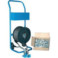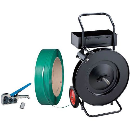 - Mobiele dispenser voor kunststof banden. Deze set bevat: een polypropyleenband met een breedte van 12 mm, een omsnoeringsgereedschap, een stalen klem van 13 mm voor omsnoeringsgereedschap, 2500 metalen clips en een metalen doos om deze te opbergen. Dankzij de verstelbare breedte en diameter van de trommel, is deze mobiele dispenser universeel en geschikt voor alle afmetingen van polypropyleen omsnoeringen.