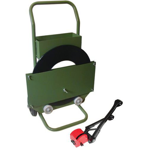 - Omsnoeringskit staal zonder klem 13 mm, bestaande uit 1 spanapparaat voor omsnoering zonder klem, een staalband 13 mm en een dispenser