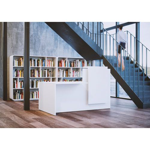 Receptiebalie met lage module rechts. Modern, compact en zeer geschikt voor de ontvangst van personen met verminderde mobiliteit. De panelen, die fungeren als receptiebalie voor bezoekers, hebben twee installatiestanden, waaronder een met een verbinding waarmee de ruimte boven het werkblad kan worden losgenomen om eenvoudig een computerscherm erop te kunnen plaatsen.