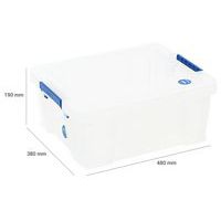 Stevige en zeer stabiele opbergbak. Praktisch, eenvoudig te transporteren dankzij de handgrepen. Snelle herkenning van voorwerpen in de bak dankzij de transparantie. Gemaakt in het UK NSF gecertificeerd Max. belasting (kg) : 200 kg