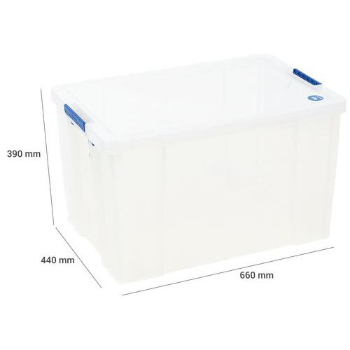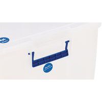 Stevige en zeer stabiele opbergbak. Praktisch, eenvoudig te transporteren dankzij de handgrepen. Snelle herkenning van voorwerpen in de bak dankzij de transparantie. Gemaakt in het UK Max. belasting (kg) : 200 kg NSF gecertificeerd