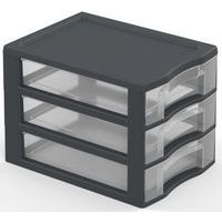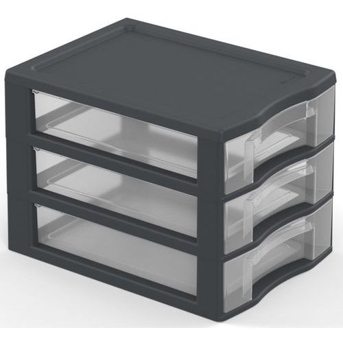Van 40% gerecyclede kunststof. Eenvoudig stapelbaar. Lades met aanslagen tegen eruit vallen. Kruistop voor het plaatsen van kleine voorwerpen. Ergonomische handgreep op elke lade. Opberglade XL: 38,5 x 37 x 14 cm.