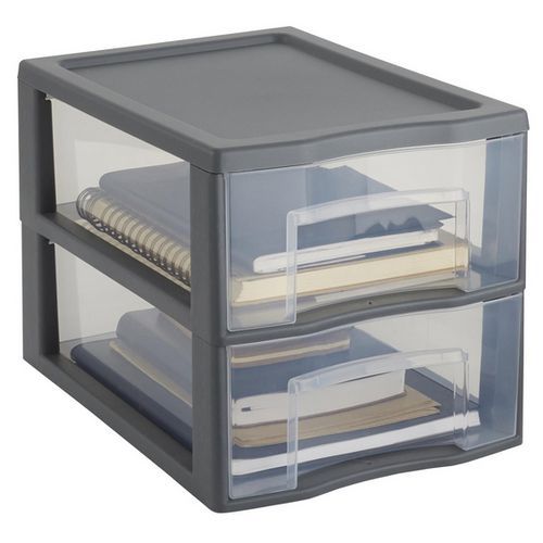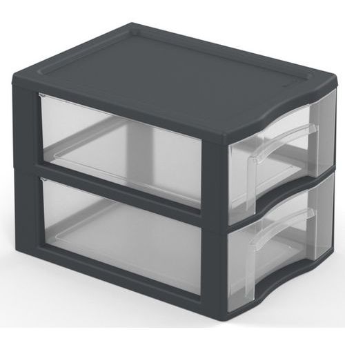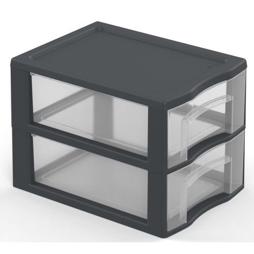 Van 40% gerecyclede kunststof. Eenvoudig stapelbaar. Lades met aanslagen tegen eruit vallen. Kruistop voor het plaatsen van kleine voorwerpen. Ergonomische handgreep op elke lade. Opberglade XL: 38,5 x 37 x 14 cm.