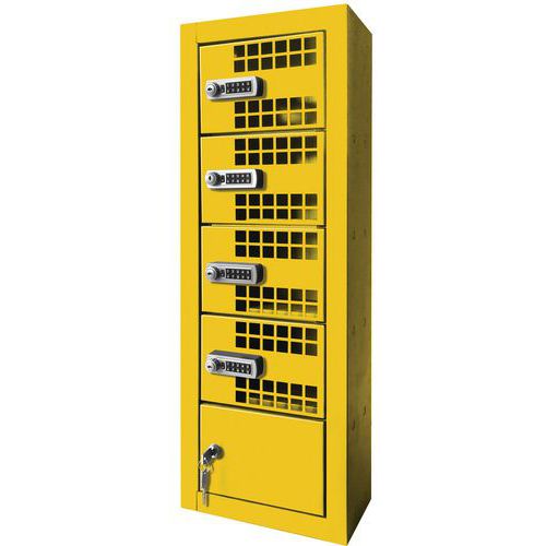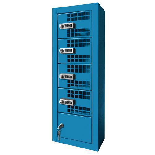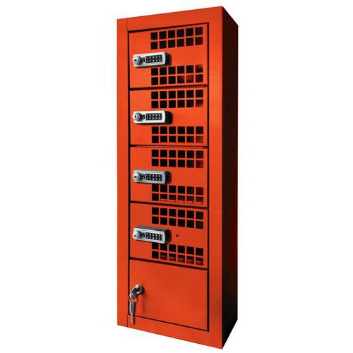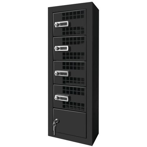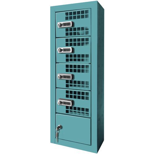 Elektrische oplaadkast voor smartphones. Robuust met body en geperforeerde deur van elektrolytisch verzinkt plaatstaal. Elektrische voeding 230 V klassiek en verbruik 40 W. Elektronisch slot met 4-cijferige code in instelmodus. Muurbevestiging mogelijk met 4 voorgeboorde gaten. Kast met mooie afwerking, epoxylak, 8 kleuren naar keuze. Praktisch met instructielabel op elke deur.
