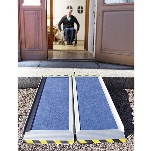 Draagbare opklapbare oprijplaat CONTRAST. Verkrijgbaar in 5 maten. Gemakkelijk te hanteren, vergemakkelijkt de toegang voor mensen in een rolstoel. Praktisch, antislip en visueel contrasterend. Onderhoudsvrij, gemakkelijk te hanteren. lichte en gemakkelijk te hanteren oprijplaat vergemakkelijkt de toegang voor mensen in een rolstoel, met rollator, kinderwagen, scootmobiel Gemaakt in de EU Toegankelijk voor mindervaliden