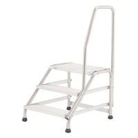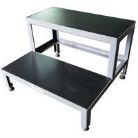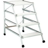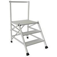 - Verstelbaar, stevig stalen opstapkrukje. Afwerking van lichtgrijs epoxylak. Brede treden met antislipbekleding. Hoogte van de eerste trede: 167 mm, met een diepte van 266 mm.