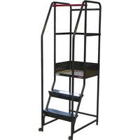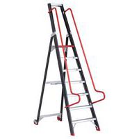 - Magazijntrapladder, eenvoudig te verplaatsen dankzij de vaste wielen aan de achterkant.