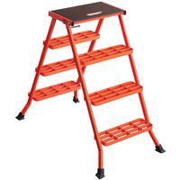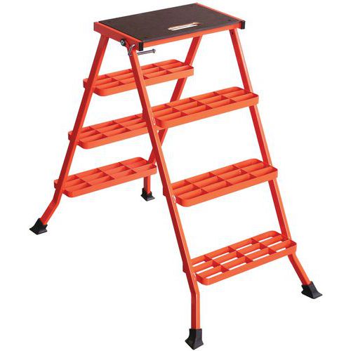 Gemakkelijk in te klappen en te vervoeren dankzij de transportgreep. Professioneel gebruik dankzij de treden met rooster van 400 x 130 x 25 mm (werkcomfort). Antislippoten. Bovenste platform van antislip multiplex 250 x 390 x 9 mm. Voldoet aan de norm EN 131.