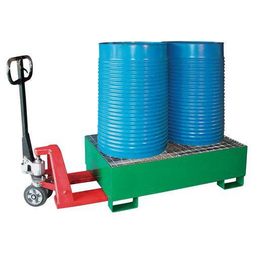 Grip mogelijk aan de 4 zijden. Kan zelfs worden verplaatst indien belast. Waterdichte bak, in de fabriek getest op scheuronderzoek. Basislaag voor bescherming tegen roest. De mazen van het platform zijn 65 x 65 mm groot. Kleur groen RAL 6029.