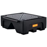 Compacte opvangbak van PE. Opvangbak en rooster van polyethyleen. Met goede chemische bestendigheid. Vorkdoorgang voor heftruck. Zonder rooster, pallets of containers kunnen rechtstreeks op de bak worden geplaatst. De bak is te hanteren als deze leeg en onbeladen is.