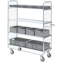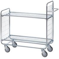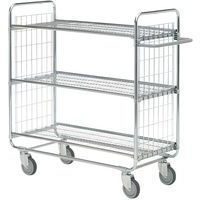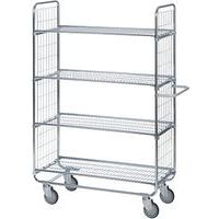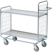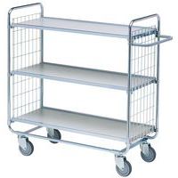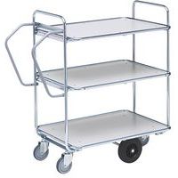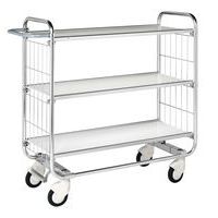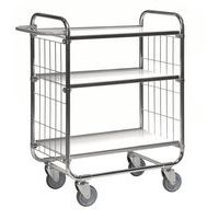 - Wagen met 3 plateaus, ideaal voor het verzamelen van onderdelen in smalle doorgangen in een winkel of magazijn. Dankzij de twee middenwielen die eronder zijn gemonteerd, is de wagen eenvoudig te draaien zelfs met een zware lading. Bruikbare hoogte gemeten tussen het onderste en middelste legbord: 395 mm. Bruikbare hoogte gemeten tussen het bovenste en het middelste legbord: 340 mm.