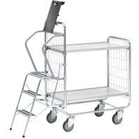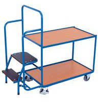 - Stabiele wagen met trap en 2 plateaus, te gebruiken voor de voorbereiding van bestellingen in het magazijn.