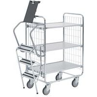 - Stabiele wagen met trap en 3 plateaus, te gebruiken voor de voorbereiding van bestellingen in het magazijn.