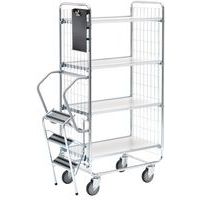 - Stabiele wagen met trap en 4 plateaus, te gebruiken voor de voorbereiding van bestellingen in het magazijn.