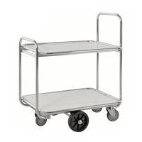 Elektrolytisch verzinkt met gelamineerde planken 2 planken - Hoogte tot bovenste plank - 770 mm - Afstand tussen planken 520 mm 3 planken - Hoogte tot bovenste plank - 970 mm - Afstand tussen planken boven 320 mm, onder 370 mm Kan met 3 of 4 zwenkwielen gemonteerd worden 4 zwenkwielen 125 mm 2 vaste wielen 200 mm Capaciteit: 300 kg