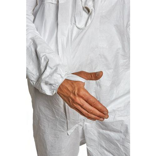 Elastiek bij de polsen, enkels, de taille en rond het gezicht. Duimopening van Tyvek®. Ritssluiting met nylon overslag van Tyvek®.