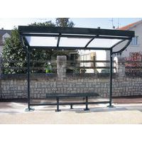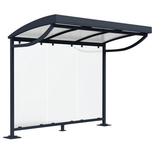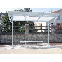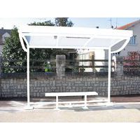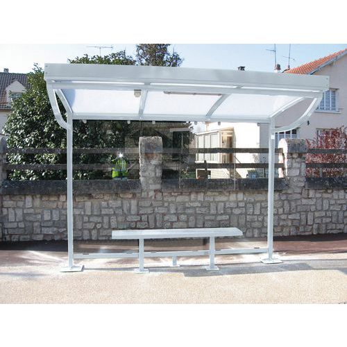 Frameconstructie in gegalvaniseerd stalen buis. Palens en dwarsbalken 80 x 60 x 5 mm. Dakbogen 60 x 30 x 3 mm. Bordplaten: gegalvaniseerd plaatstaal van 2 mm dikte. Verstelbare voeten op plaat 200 x 200 x 5 mm. Montagebevestiging in roestvrij staal, klasse A2. Polycarbonaat honingraatbedekking behandeld met UV-bescherming, dikte 10 mm. Afwerking met thermohardende polyesterverf gebakken bij 200°C, bestand tegen UV. Bekleding met helder gehard glas 'veiligheid' van 8 mm dikte. Bevestiging door M12/65 verankeringsbouten op betonnen vloer, betonnen blokken of op een schone en vlakke asfaltlaag. De asfaltlaag moet minimaal 7 cm dik zijn.