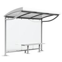 Frameconstructie in gegalvaniseerd stalen buis. Palens en dwarsbalken 80 x 60 x 5 mm. Dakbogen 60 x 30 x 3 mm. Bordplaten: gegalvaniseerd plaatstaal van 2 mm dikte. Verstelbare voeten op plaat 200 x 200 x 5 mm. Montagebevestiging in roestvrij staal, klasse A2. Polycarbonaat honingraatbedekking behandeld met UV-bescherming, dikte 10 mm. Afwerking met thermohardende polyesterverf gebakken bij 200°C, bestand tegen UV. Bekleding met helder gehard glas 'veiligheid' van 8 mm dikte. Bevestiging door M12/65 verankeringsbouten op betonnen vloer, betonnen blokken of op een schone en vlakke asfaltlaag. De asfaltlaag moet minimaal 7 cm dik zijn.
