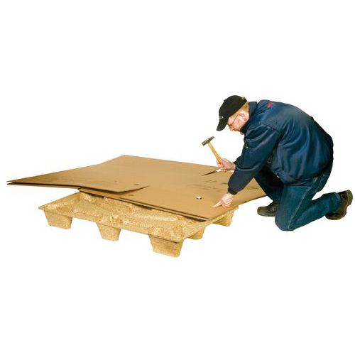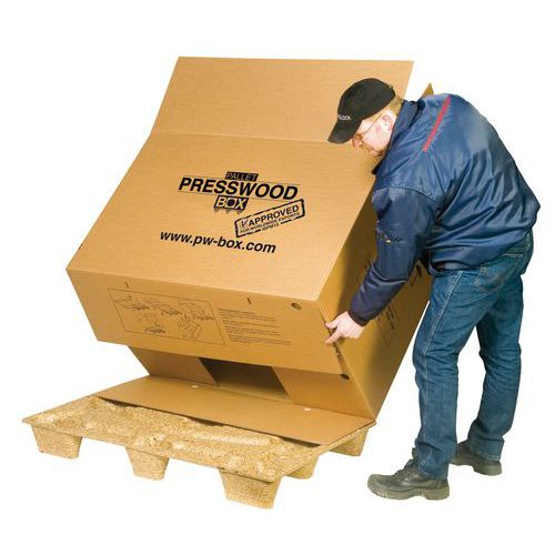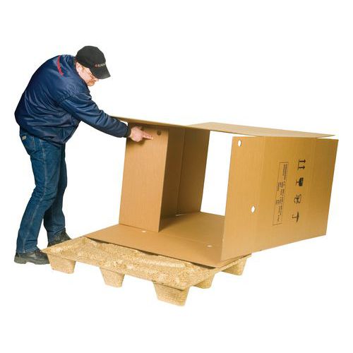 Opening aan de zijkant: eenvoudiger laden. Pallet zonder spijkers of schroeven voor extra veiligheid. Eenvoudig en snel te monteren zonder omsnoering. Kist op pallet, licht en herbruikbaar. Uitstekende bescherming van producten.