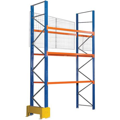 Zeer robuuste stalen palletstelling voor zware lasten, met valbeveiligingsrooster. Innovatieve technologie: optimaliseert de opslag op basis van de belasting en de verpakking. Ligger met eindkoppelstukken met 7 verankeringspunten voor een veilige bevestiging. Zeer betrouwbare vergrendeling van liggers met veiligheidsborgclips op de staanders. Toevoeging van extra niveaus mogelijk, mits rekening wordt gehouden met de maximale belasting per element. Palletstelling voor handmatig transport of met pallettruck/wagen. Fraaie afwerking met epoxylak, warm geverfd, blauw. Gelast gaas met mazen van 5x7 op het buisframe.