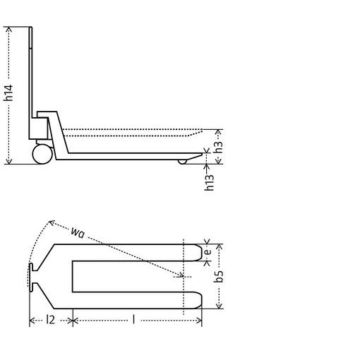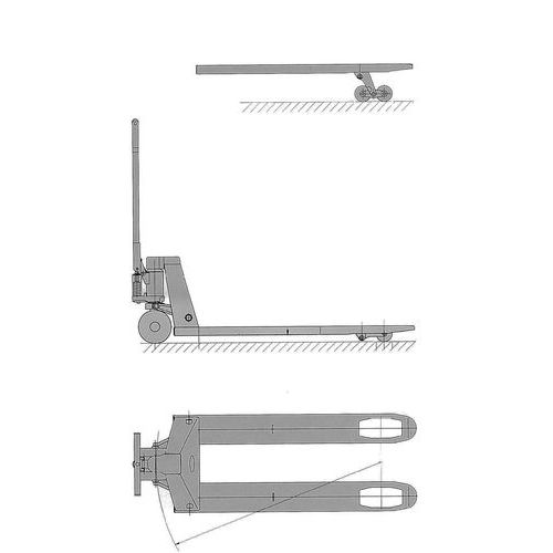 | Productnaam | Pallettruck, Max. belasting: 2300 kg, Lengte vork: 800 mm, Type vorkwiel: Enkel |