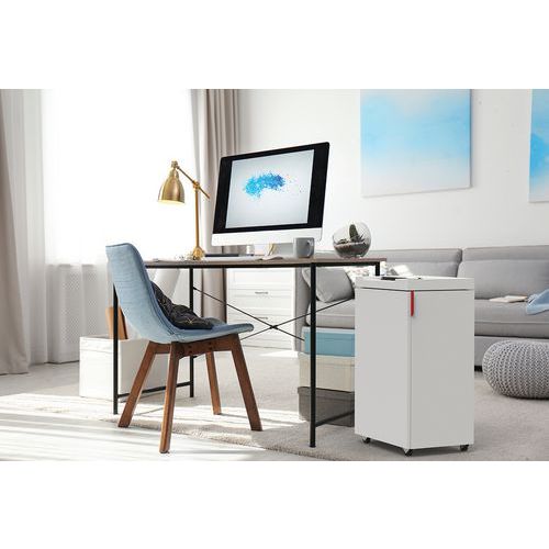 Automatisch starten/stoppen via sensor. Papiervernietiger met mesblok van speciaal staal, robuust en veilig. Houten meubel met deur, op wielen. Praktische opvangbak met handgreep. Robuust en stofdicht aandrijvingssysteem. Ideaal voor thuiswerken.