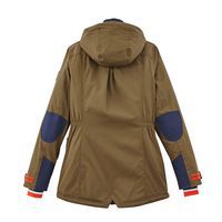 Met verticaal geplaatste borstzakken met rits, grote lage zakken met drukknopen bij de opening aan de bovenkant en opening aan de zijkant met warme voering.