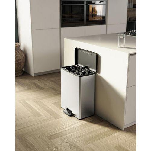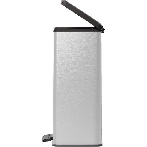Rechthoekige pedaalemmer van kunststof in metaallook. Gemaakt van 70% gerecyclede materialen. Voorzien van twee binnenemmers (2x26L) van kunststof. Makkelijk schoon te maken.