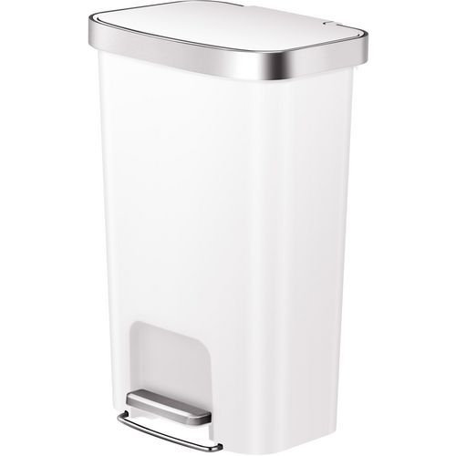 Functionele kunststof pedaalemmer met een licht gebogen en opvallende roestvrijstalen rand en een deksel dat zacht sluit