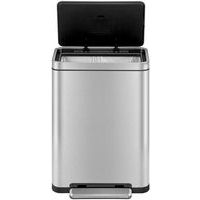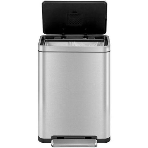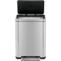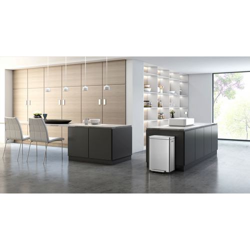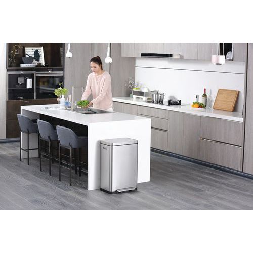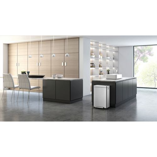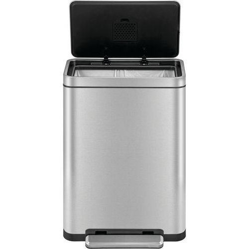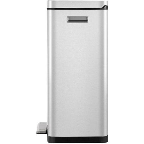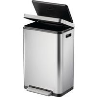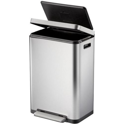 Elegante, rechthoekige afvalbak met een extra groot pedaal, een binnenemmer van synthetisch materiaal en een deksel met geruisloze sluiting en stay open-functie.