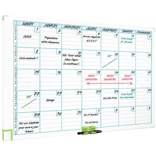 - Levering incl.: ophangbevestiging, afleggoot, datumstrokenset 3, met maandnamen (in vijf talen), weeknummers en dagen (1-7) en een whiteboard marker.