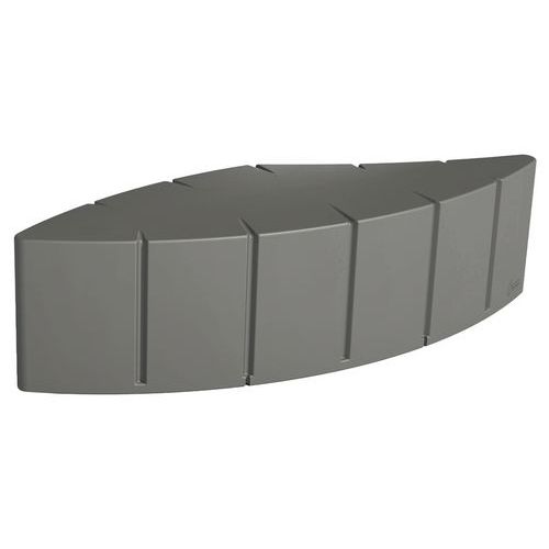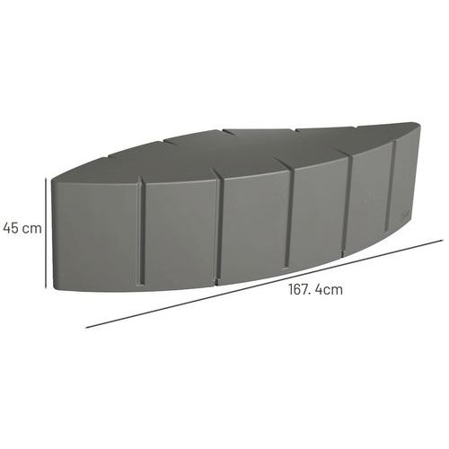 In in de massa gekleurd rotatiegegoten polyethyleen, gemiddelde dikte 7 mm. Installatie binnen of buiten doordat het gebruikte polyethyleen weer- en UV-bestendig is (temperatuur: -30°C/+60°C). Onderhoud: hogedrukreiniger (eenmaal/jaar). 10 standaardkleuren. Module om te ballasten met zand (niet inbegrepen) of optioneel aan de grond te bevestigen met draadstangen (4 verankeringszones). Andere standaard RAL's op aanvraag.